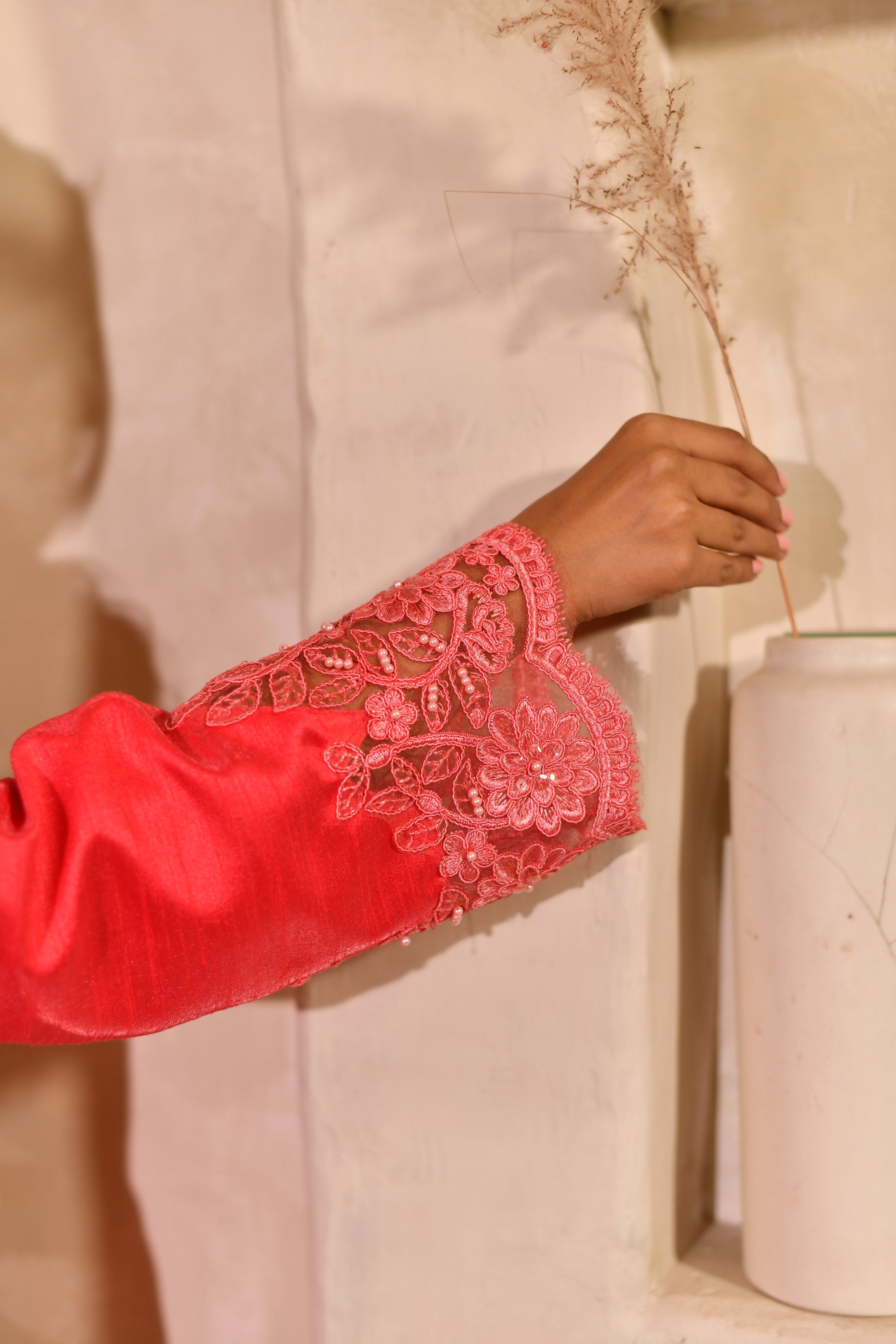 A vibrant fuchsia kurta set crafted in lustrous silk, featuring delicate lace detailing along the hem and sleeve cuffs. The straight-cut kurta showcases a subtle V-notch neckline, lending a graceful yet contemporary charm. Paired with matching Farshi Salwar, the ensemble embodies effortless elegance and festive sophistication. Styled with a statement silver clutch, this look is perfect for intimate celebrations, soirées, and festive gatherings.