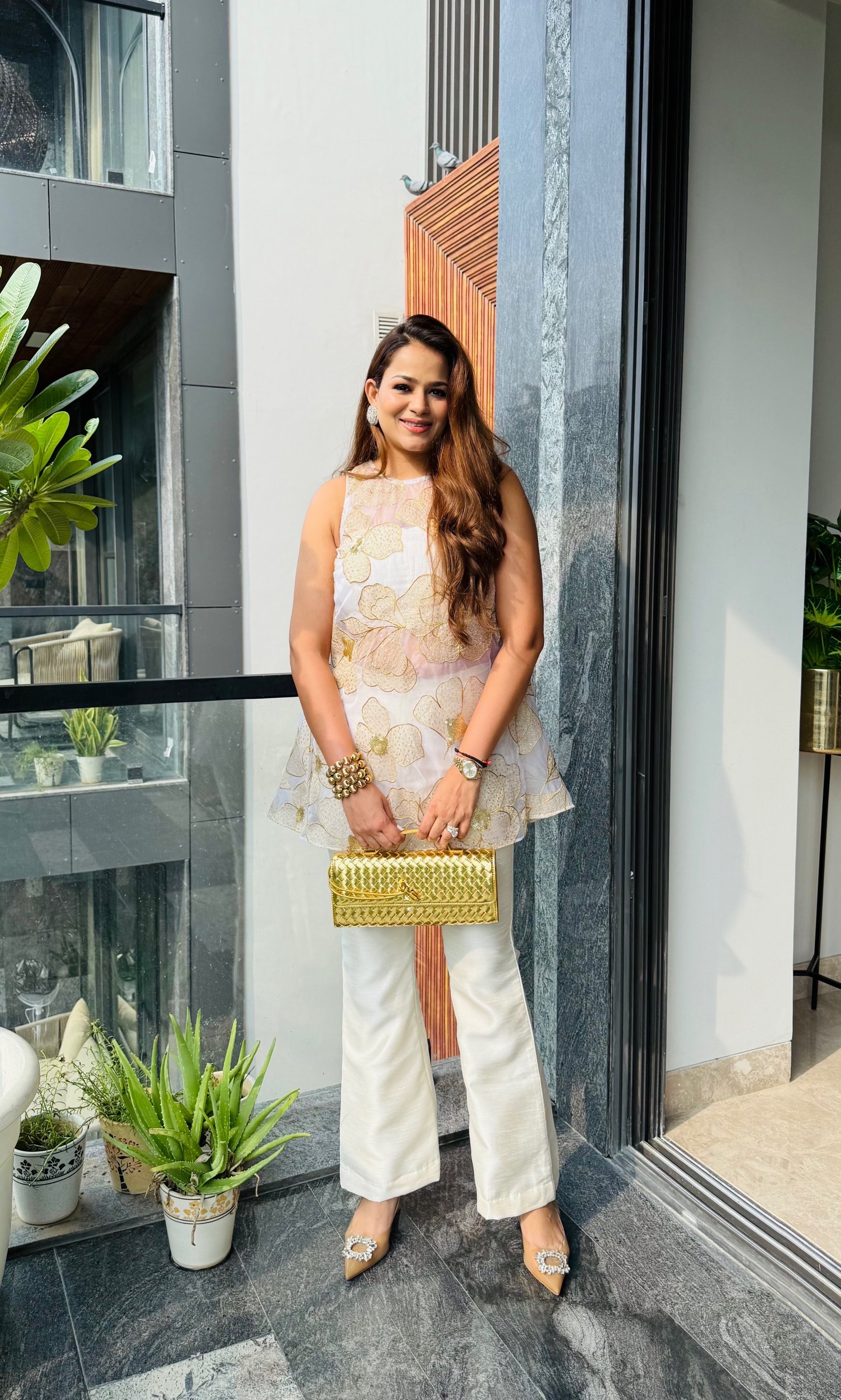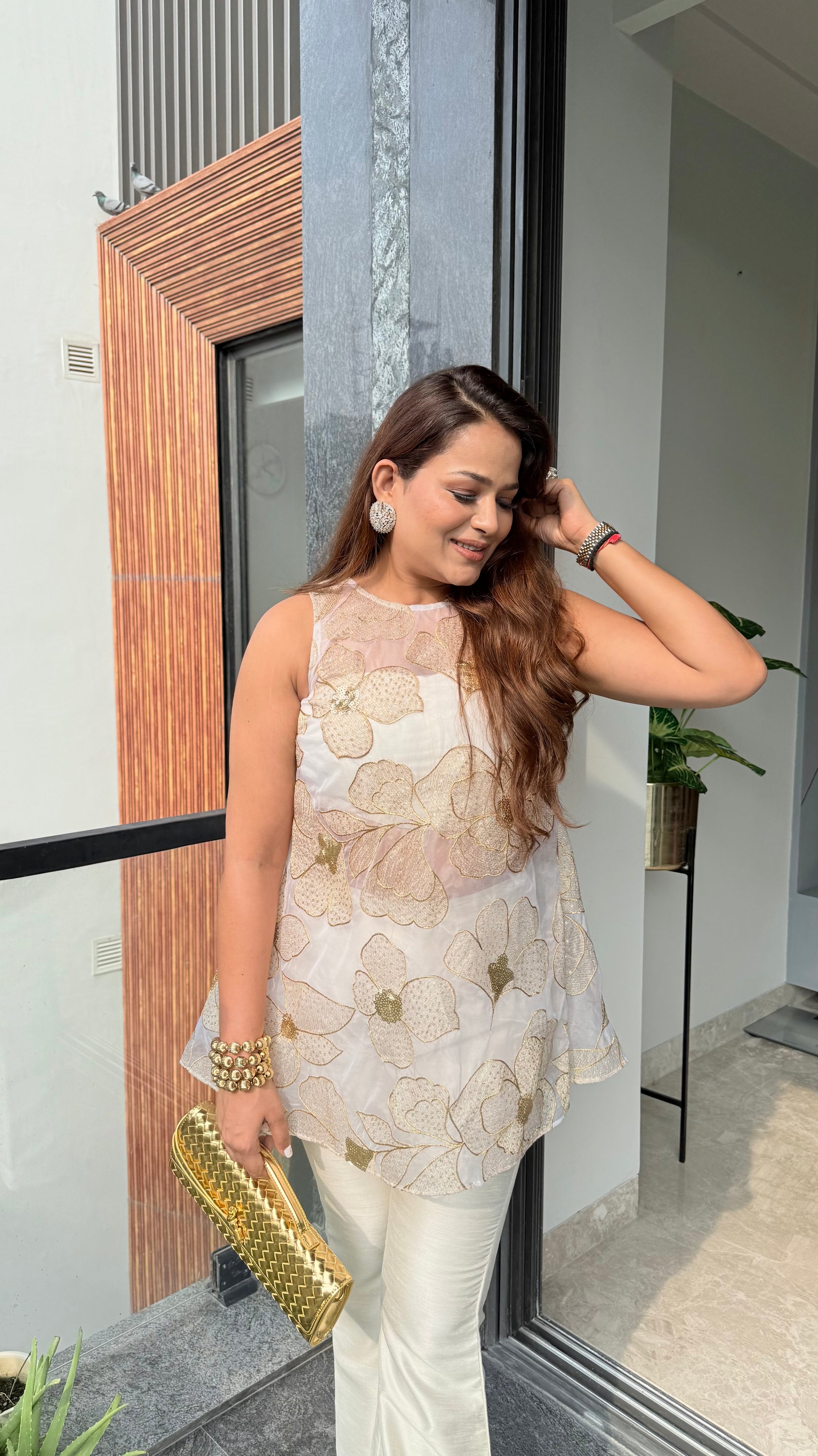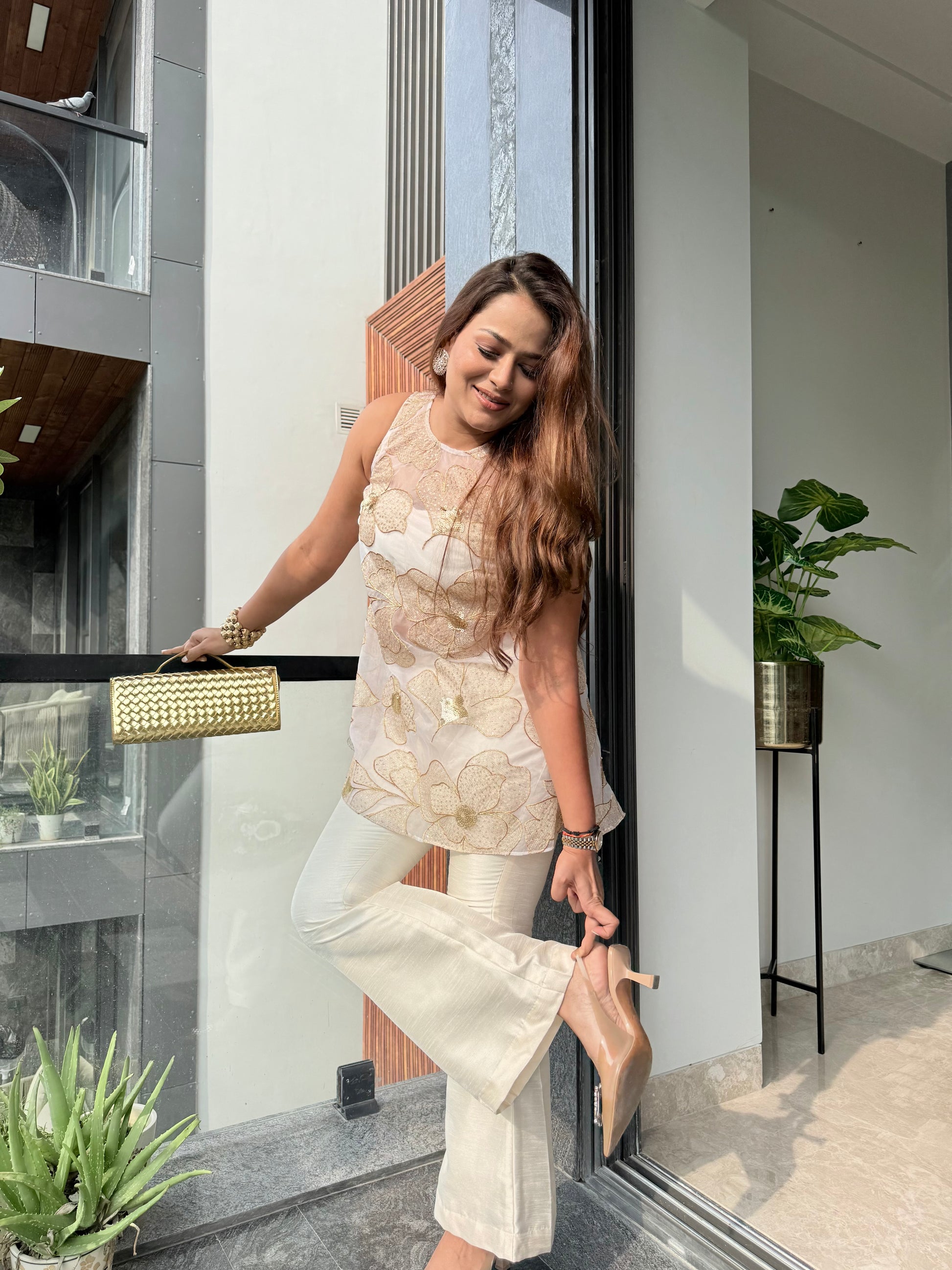 Effortlessly elegant, this ivory co-ord set features flared pants paired with a sheer floral embroidered tunic. Subtle shimmer and soft silhouettes make it perfect for chic daytime events or intimate celebrations.