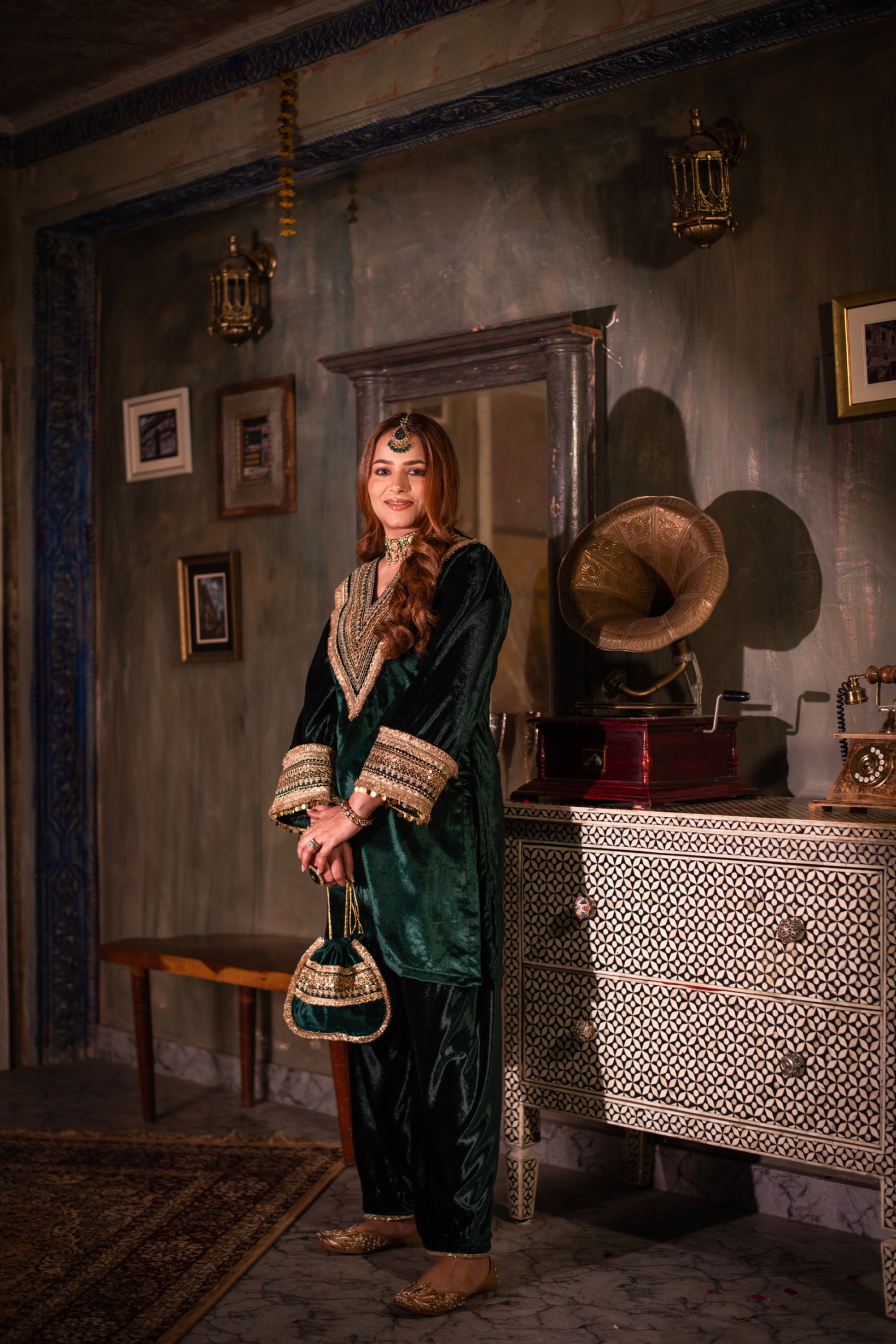 The Mughal Set is a tribute to regal grandeur, crafted in deep emerald velvet that exudes luxury from every angle. The kurta features an opulent hand-embellished V-shaped neckline, adorned with intricate gold zari, sequence work, and traditional Mughal-inspired patterns. The sleeves mirror this richness with heavily detailed cuffs finished with beads and lace, adding a dramatic yet refined touch.