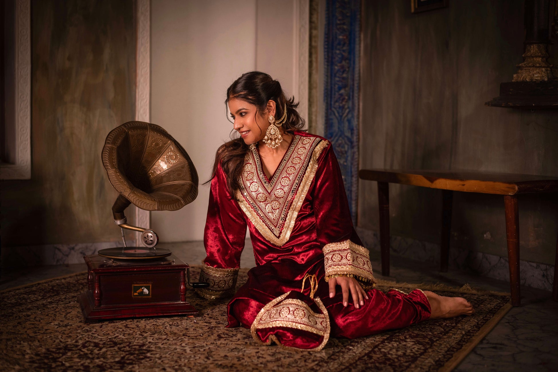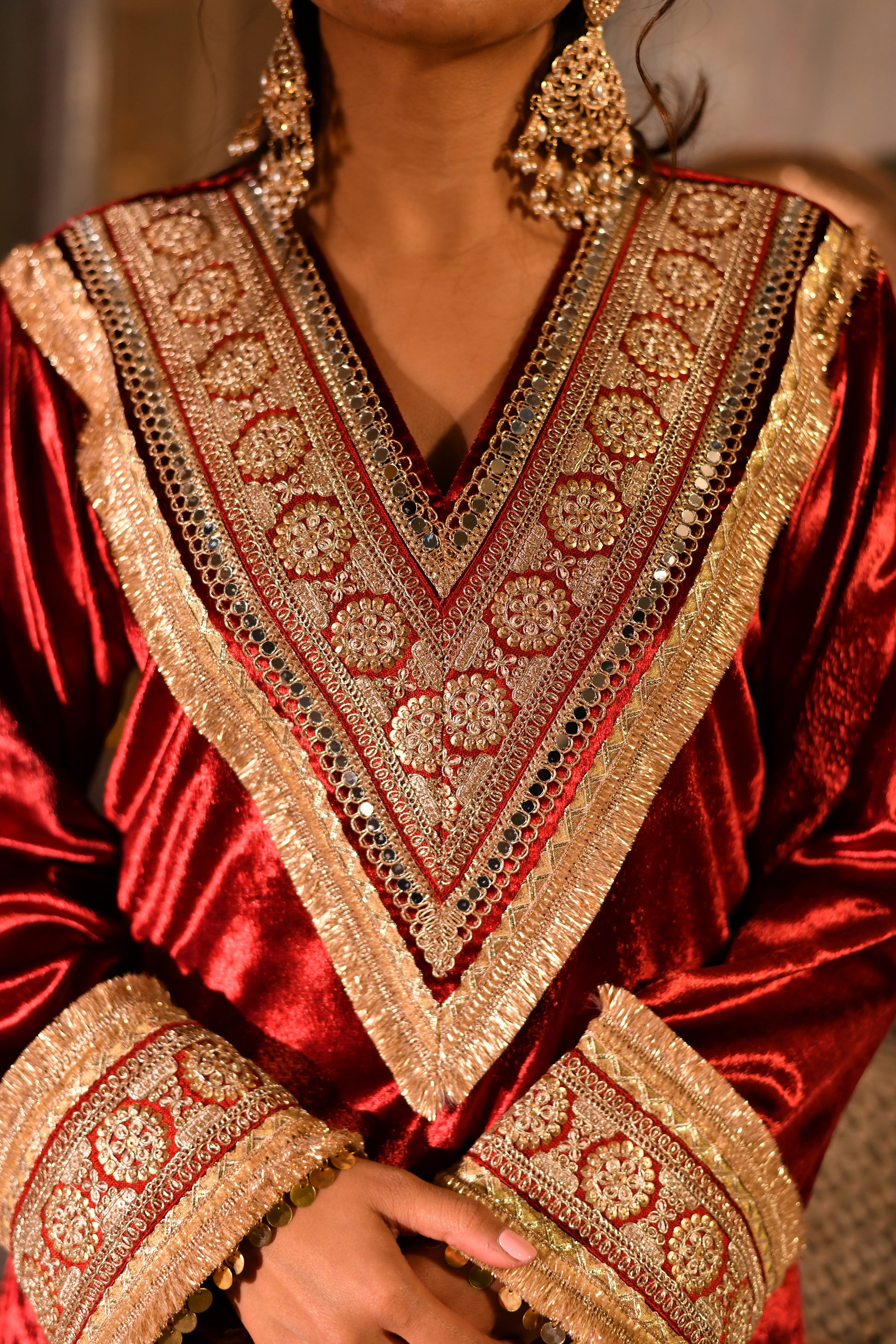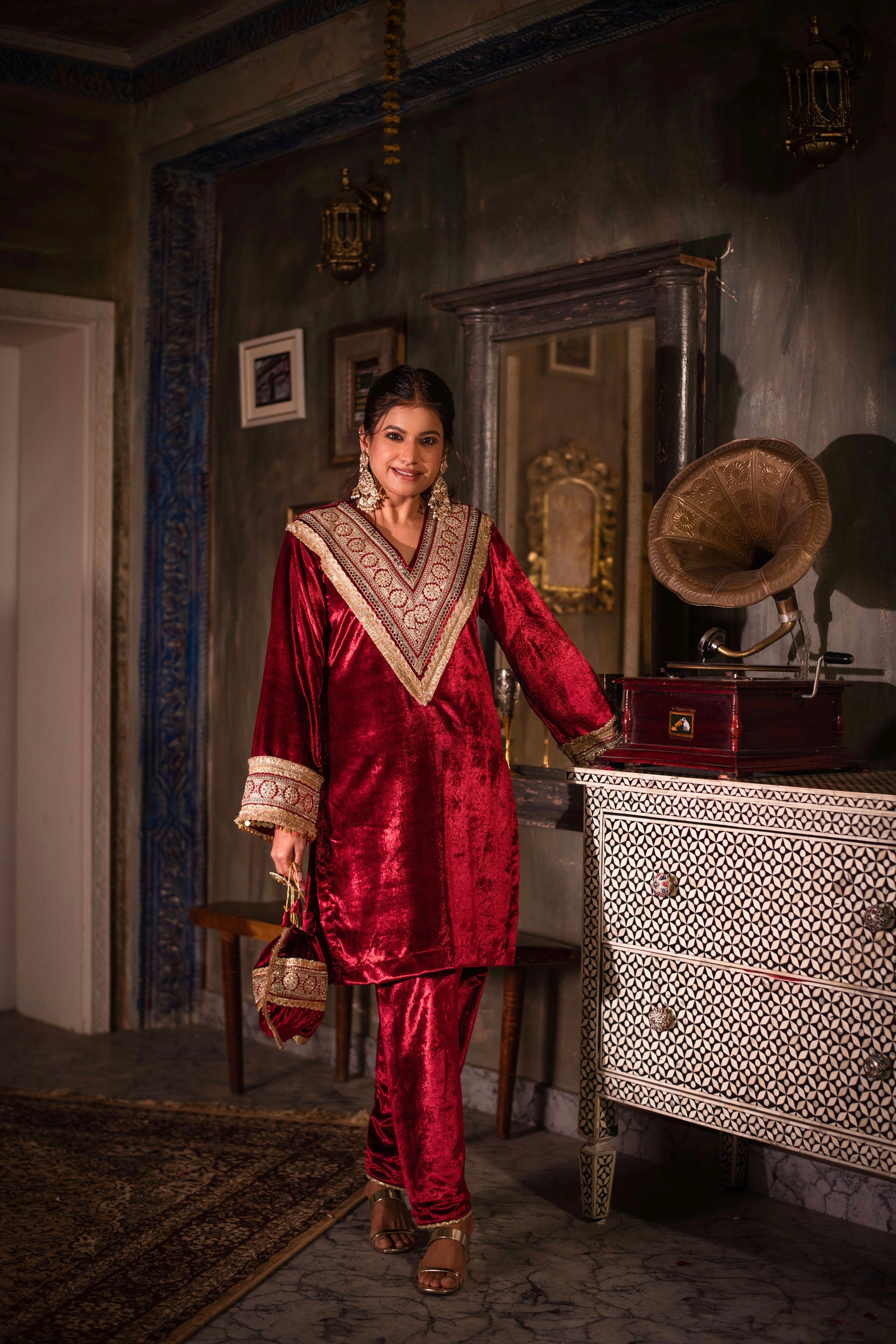 Paired with matching velvet trousers and a beautifully crafted potli bag, the ensemble completes a look reminiscent of royal courts and timeless heritage. Perfect for weddings, evening festivities, and occasions where you want to make an unforgettable statement.