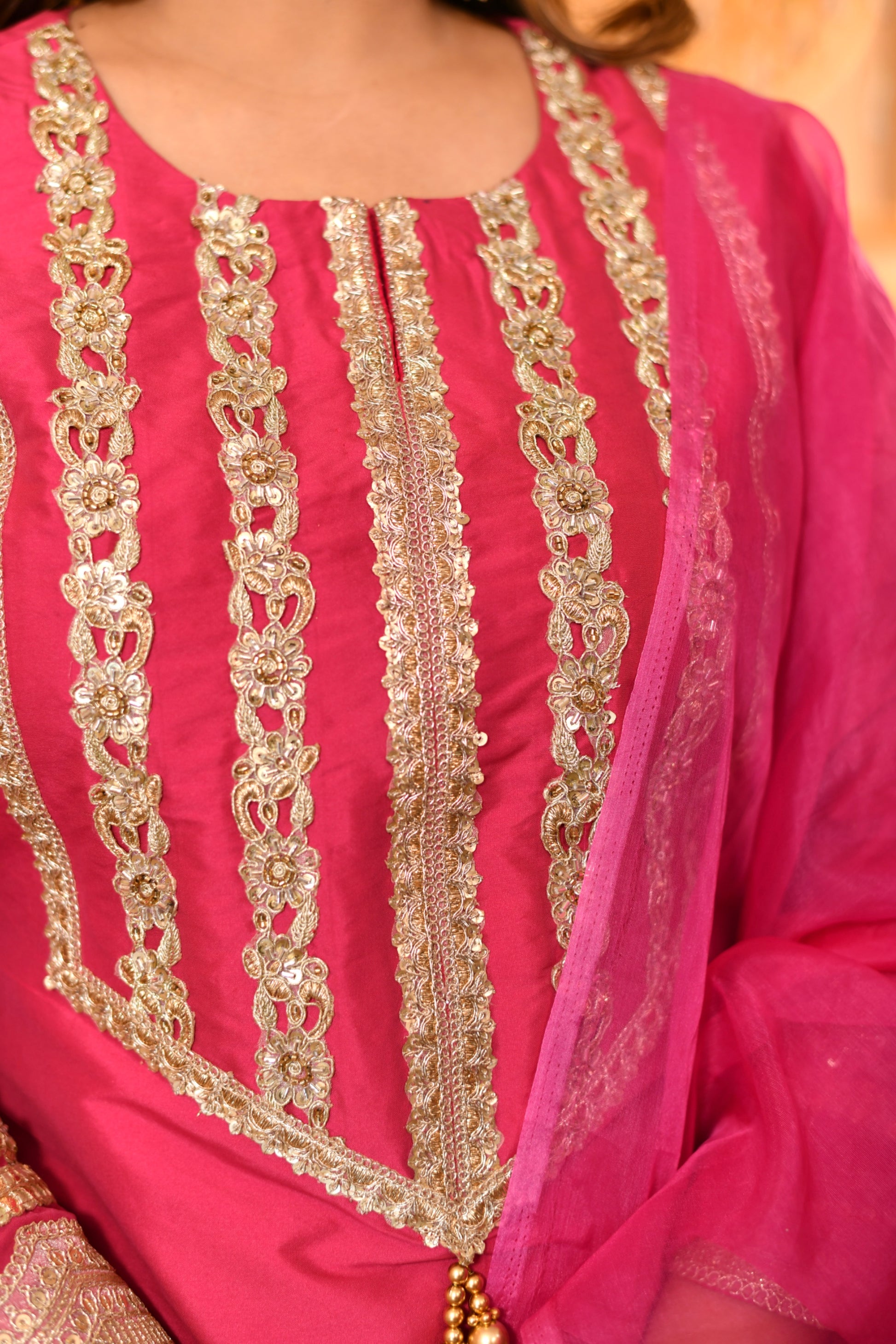 This set features a rich fuchsia silk kurta adorned with delicate embroidered detailing along the neckline, adding a touch of regal sophistication. The soft, flowing organza dupatta in matching fuchsia with a contrasting lime-green border enhances the look with its sheer, ethereal finish.