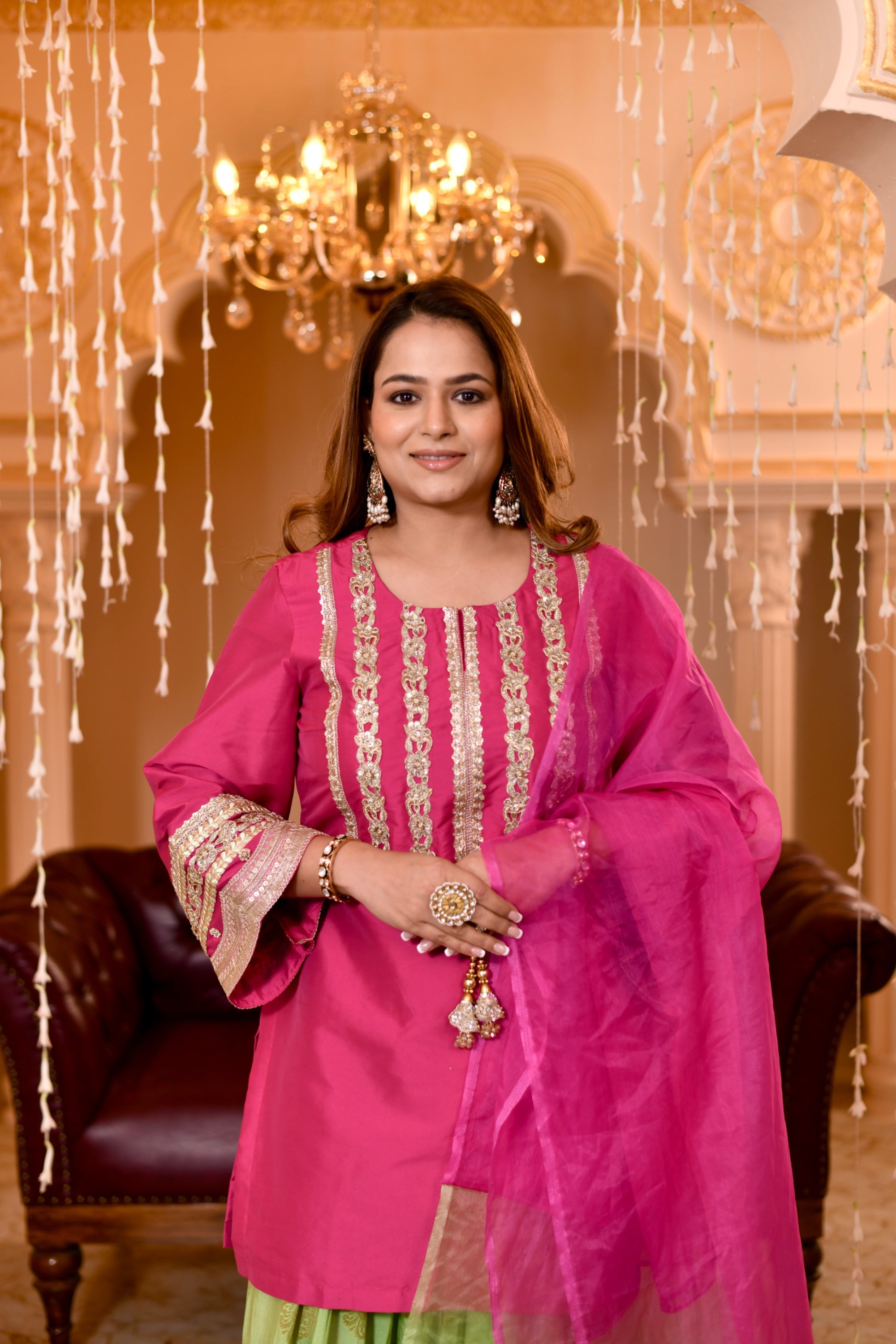 Paired with it are lime-green patiala-style bottoms, highlighted with subtle gold motifs that add festive sparkle while maintaining comfort and movement. The combination of bold hues and fine craftsmanship makes this set perfect for celebrations, pre-wedding functions, festive gatherings, and elegant daytime events.
