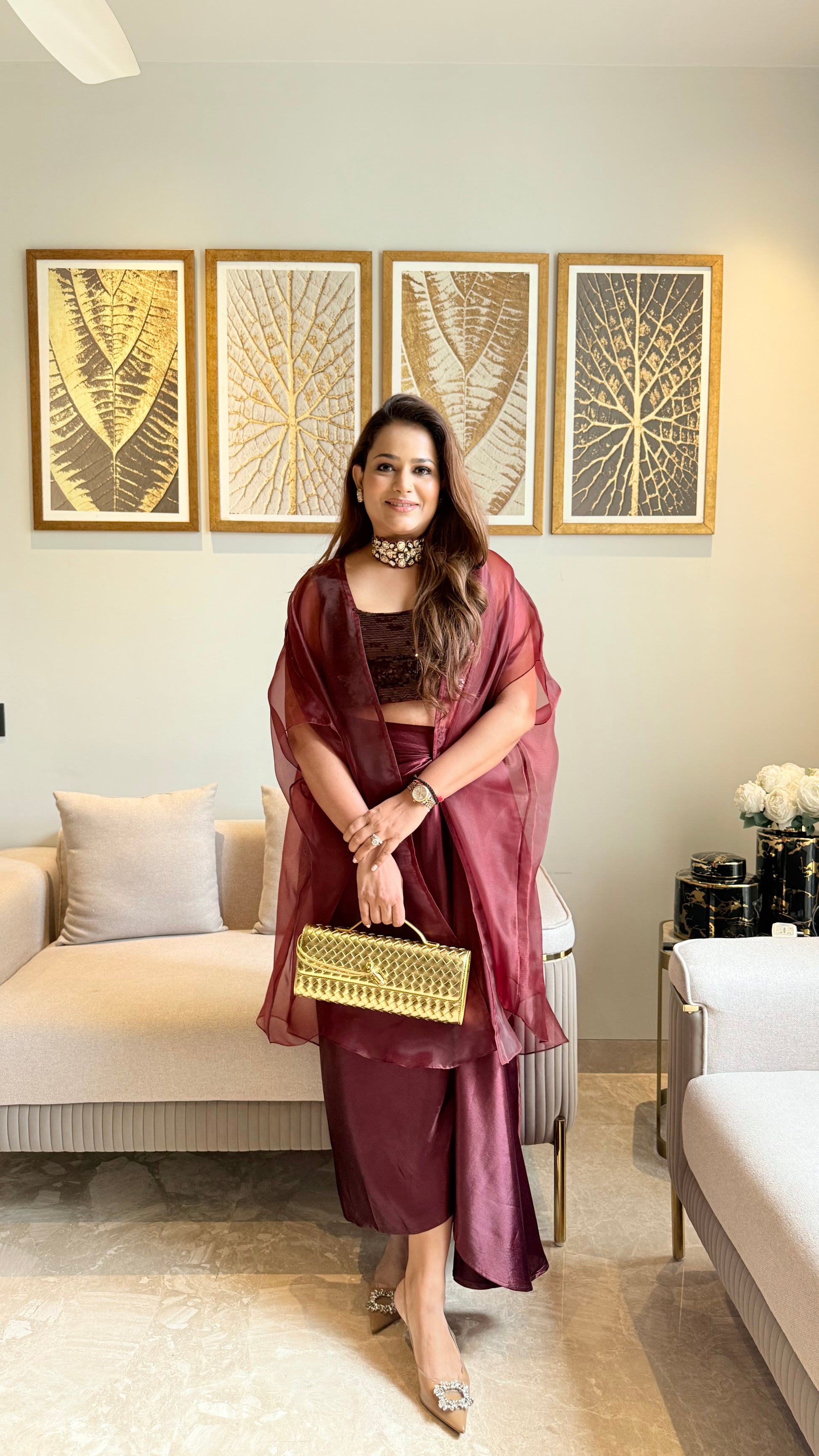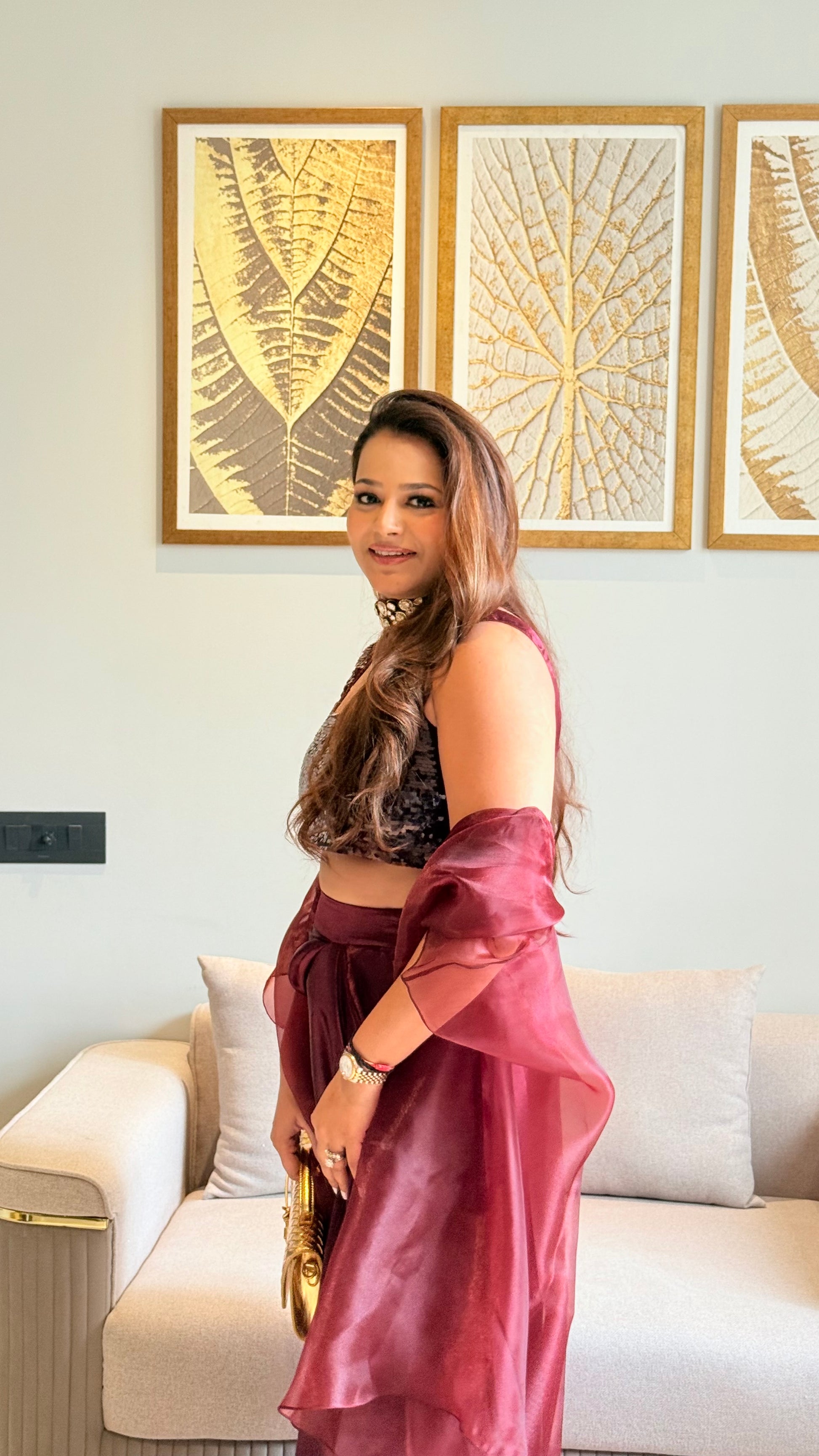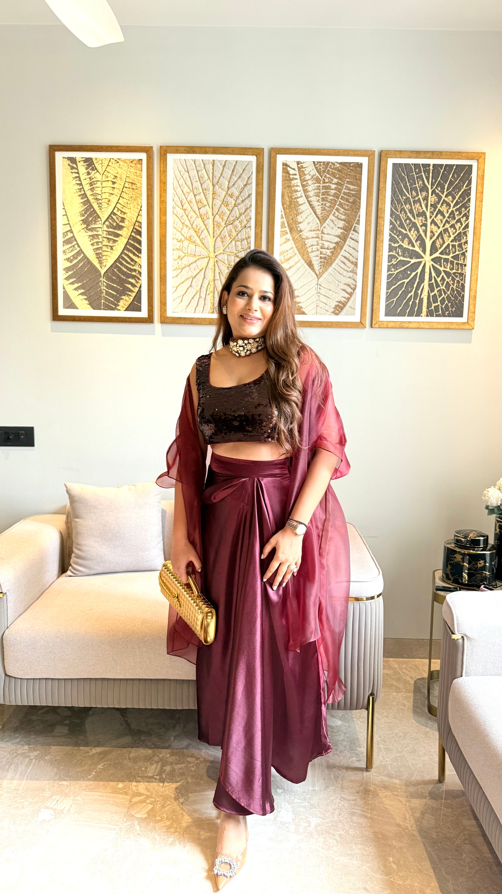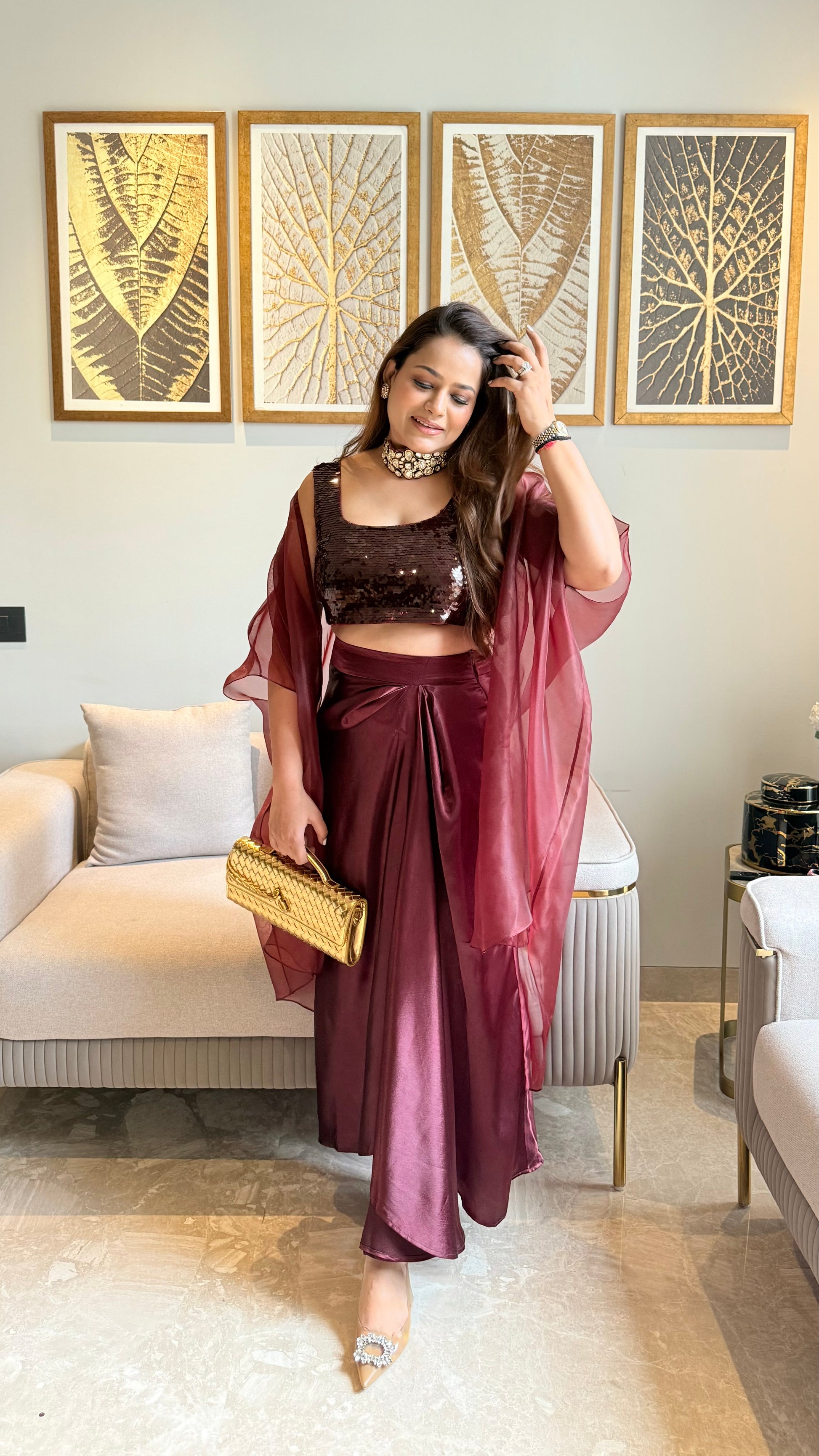 A stunning fusion outfit that blends glamour with grace. This ensemble features a deep wine sequin crop top paired with a luxurious satin draped skirt, all brought together with a flowy sheer organza overlay.Ideal for festive occasions, cocktail nights, or intimate celebrations.