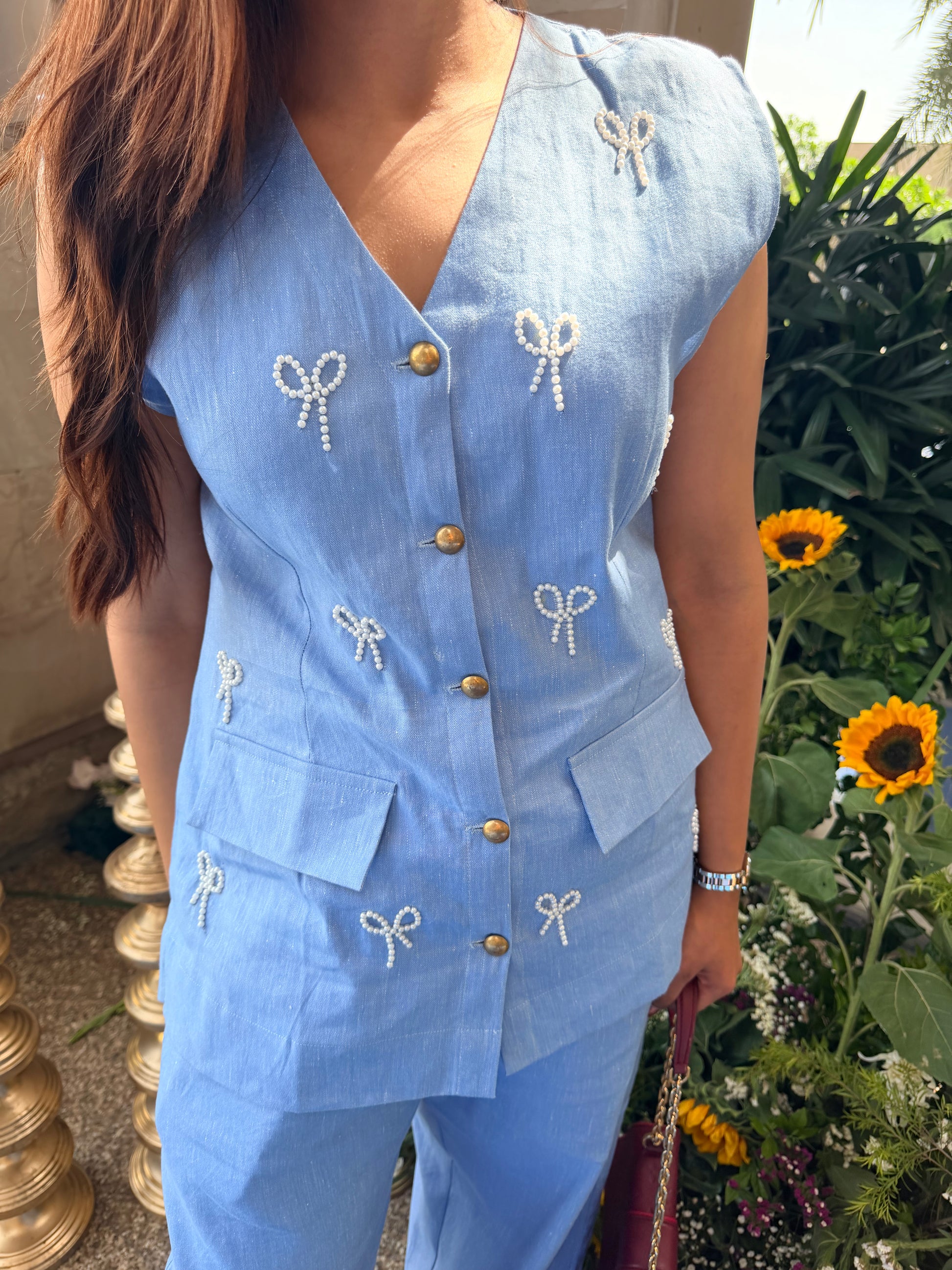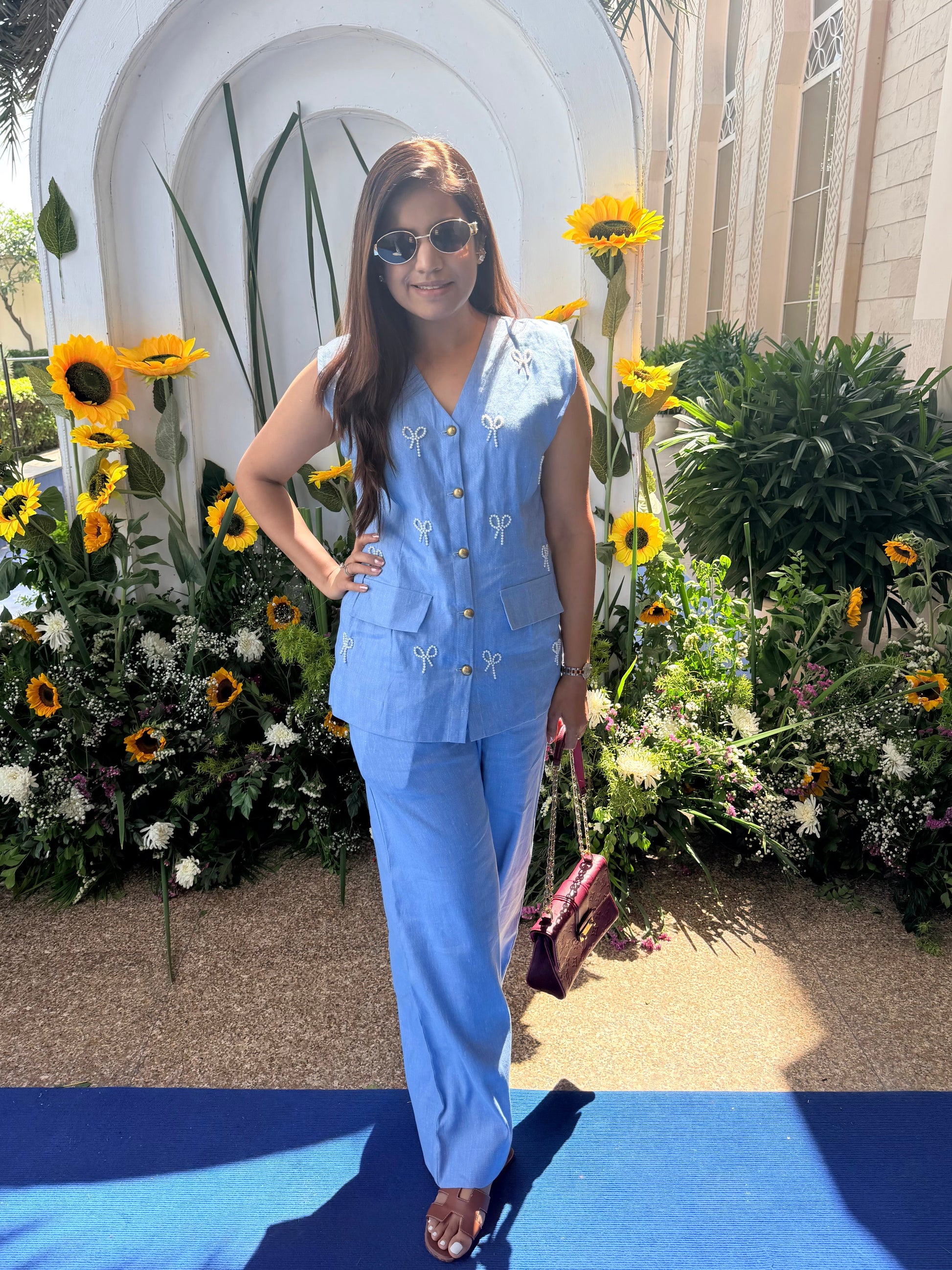Fresh, effortless, and made for sunlit days — this powder blue co-ord set brings together comfort and understated elegance. The sleeveless top features delicate embroidered motifs and statement buttons, paired with relaxed straight-fit pants for an easy, flattering silhouette.