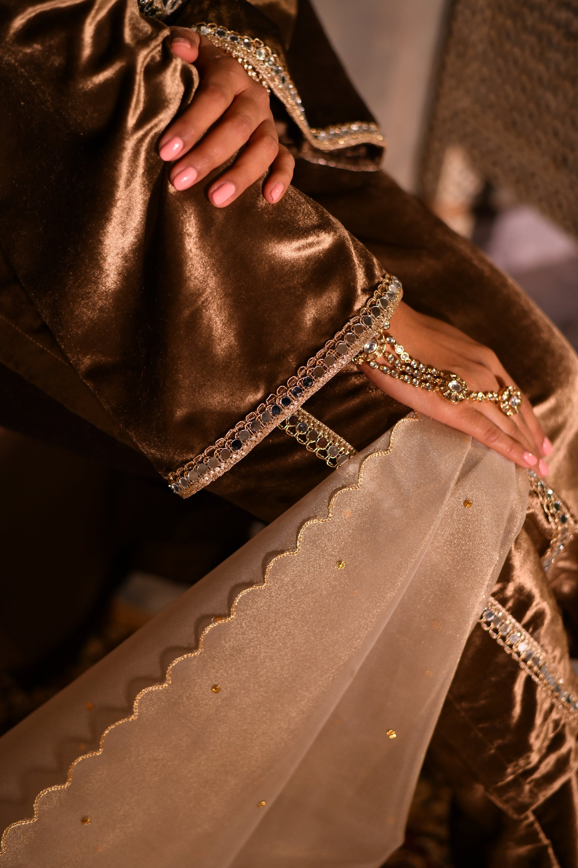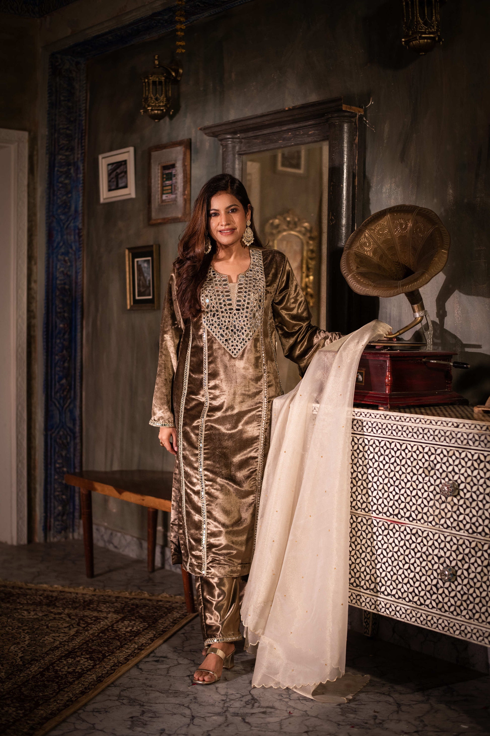 This outfit exudes timeless sophistication with its soft mouse-brown velvet fabric that catches the light beautifully. The long, straight-cut kurta is adorned with intricate mirror work along the neckline and front panel, adding a touch of festive sparkle without overpowering the look. Delicate embroidered borders run vertically down the kurta, creating an elongating and graceful silhouette. The ensemble is paired with matching velvet trousers that complement the rich texture of the top.